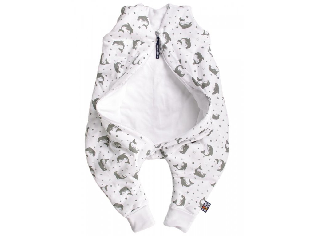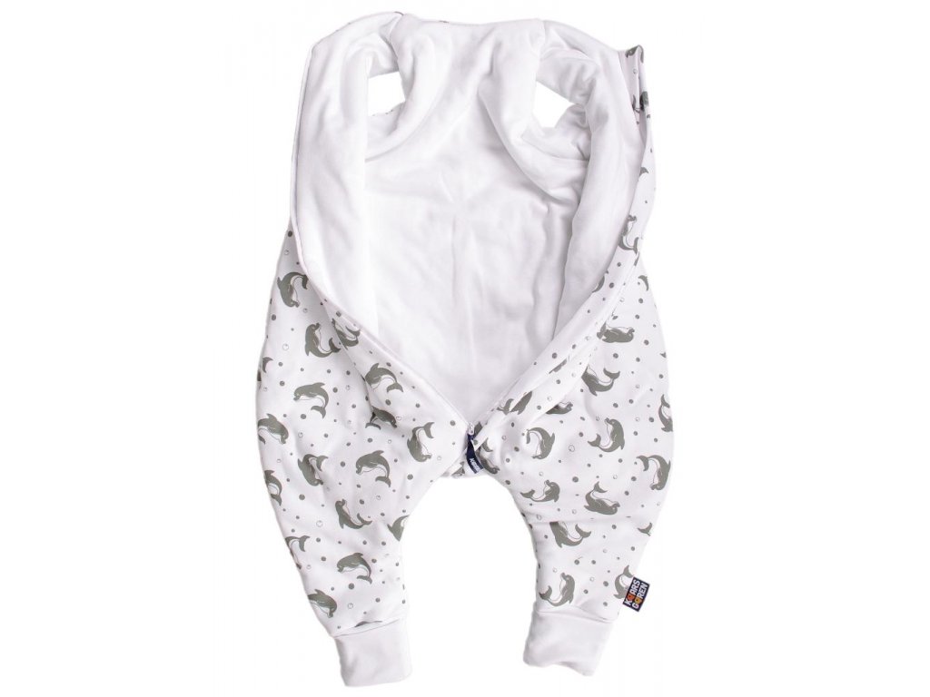 Spací vak je vyrobený zo 100% bio-bavlny a vo vnútri je zateplený antibakteriálnym rúnom. Spací vak je možné využiť aj ako celodenný overal, má bielu farbu s motívom sivých delfínov. Zip umožní otvorenie spacieho vaku po celej dĺžke a má látkovú krytku, ktorá zabraňuje privretiu krku do zipsu. Dĺžka spacieho vaku je 100 cm, to zodpovedá výške dieťaťa k ramenám. Navyše má spacík návleky na nohy, ktoré je možné zaklopiť a použiť ako ponožky, takže dieťa bude mať nohy pekne v teple. Je možné ho prať v práčke na 30 °C. Spací vak vyrábame v Českej republike.