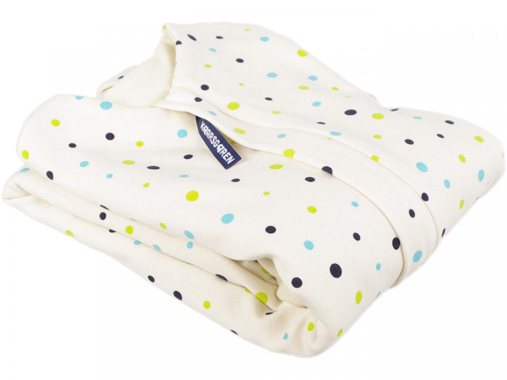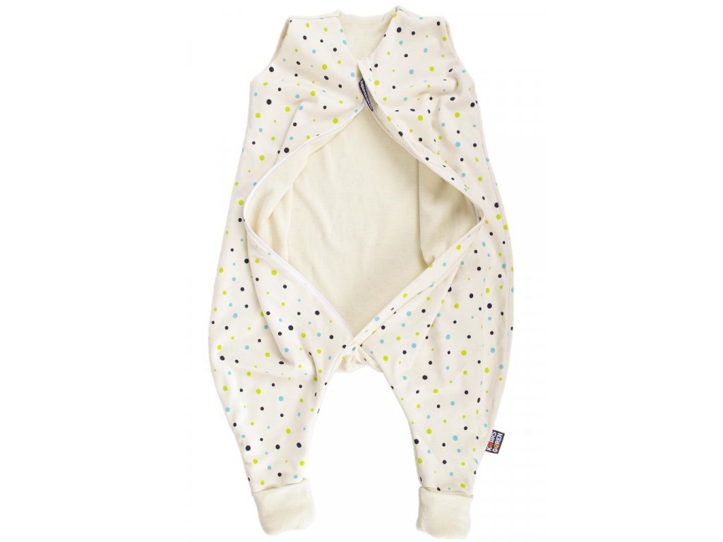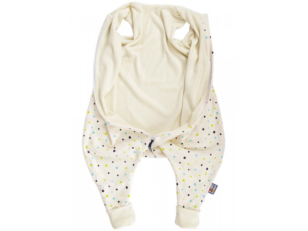 - Bio-bavlnený detský spací vak s podšívkou z merino vlny as motívom bodiek.