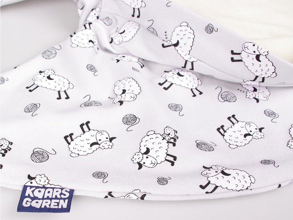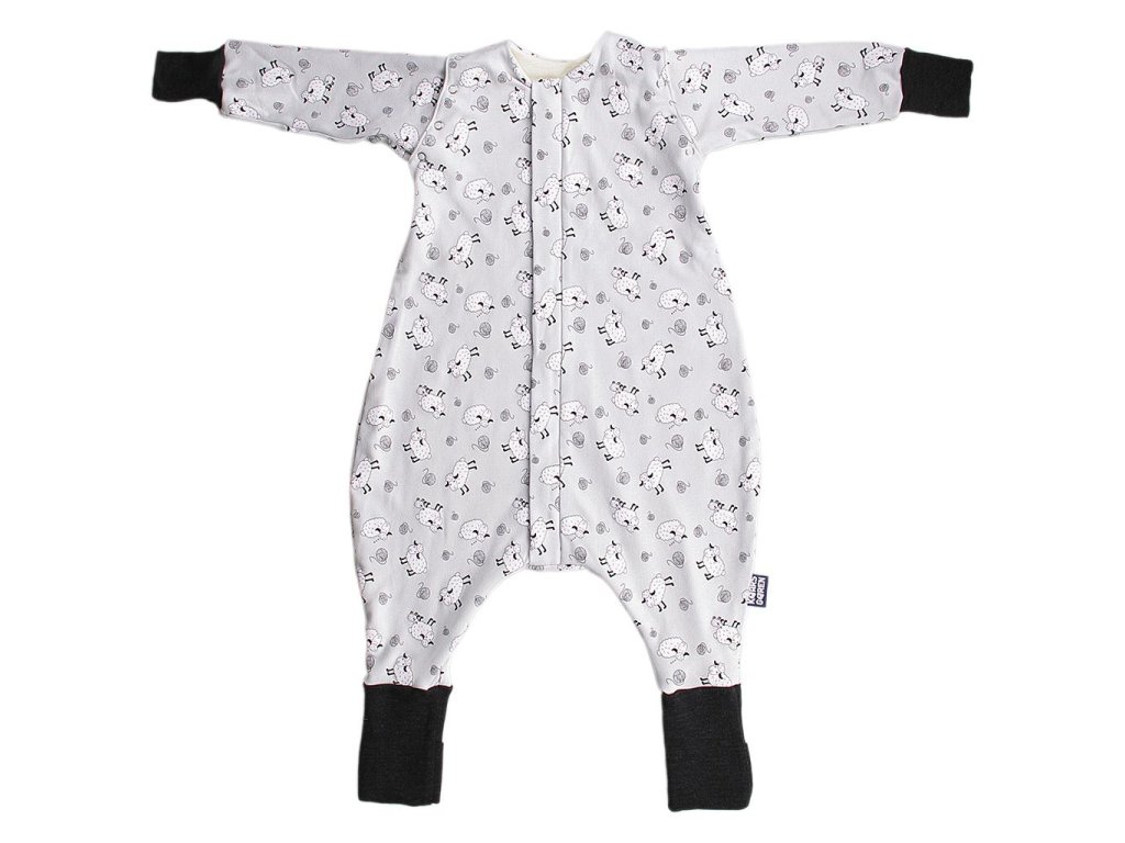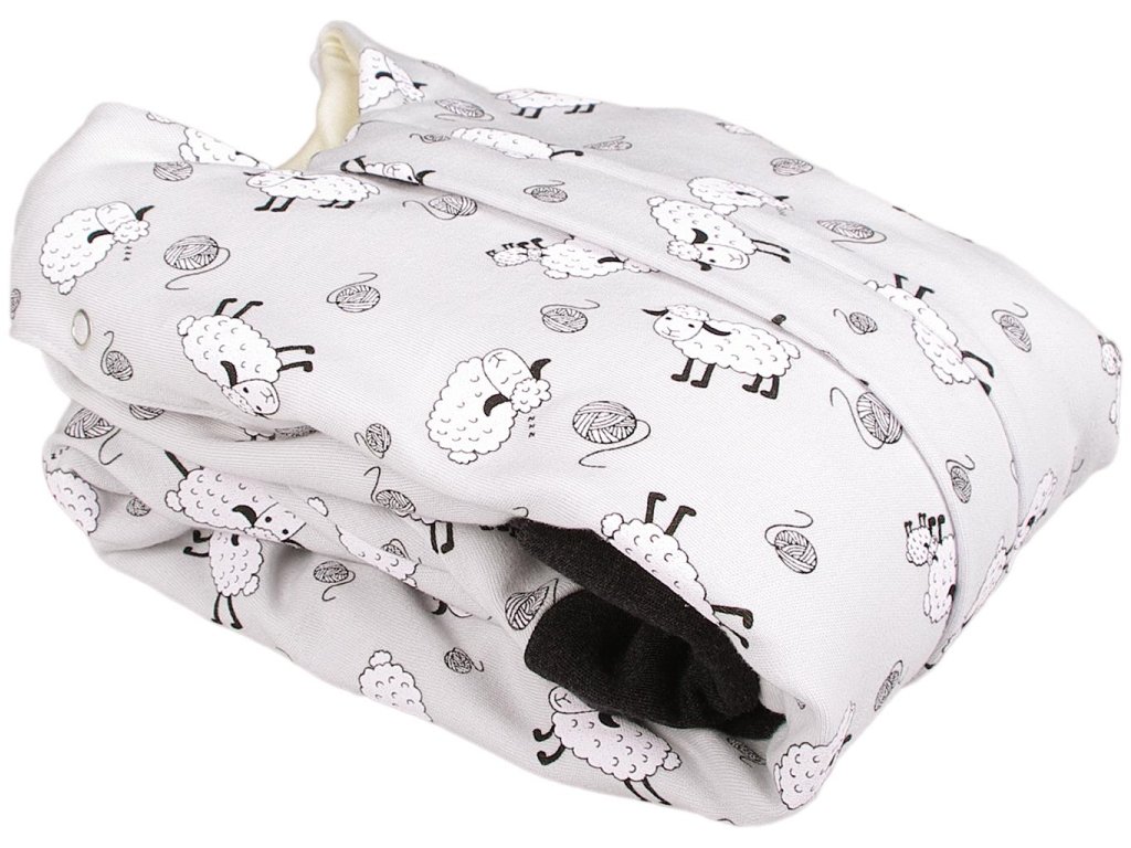 - Bio-bavlnený detský spací vak s podšívkou z merino vlny s motívom sivých oviec.