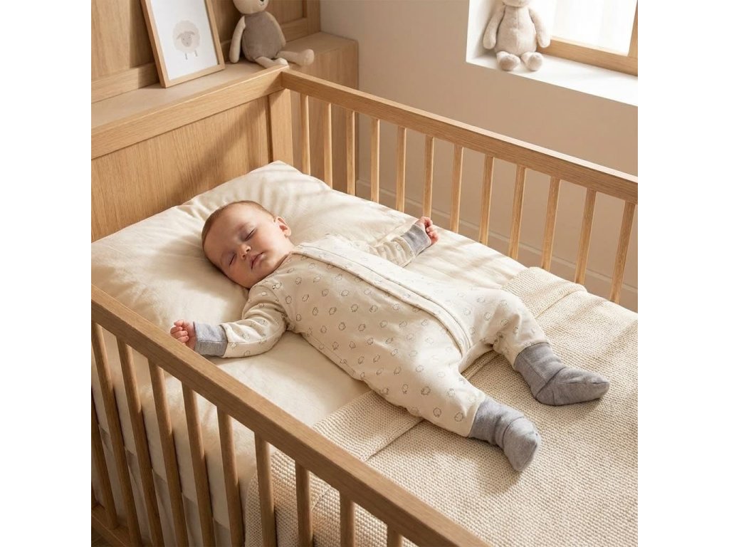 - Bio-bavlnený detský spací vak s podšívkou z merino vlny s motívom baránkov.