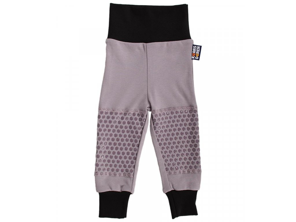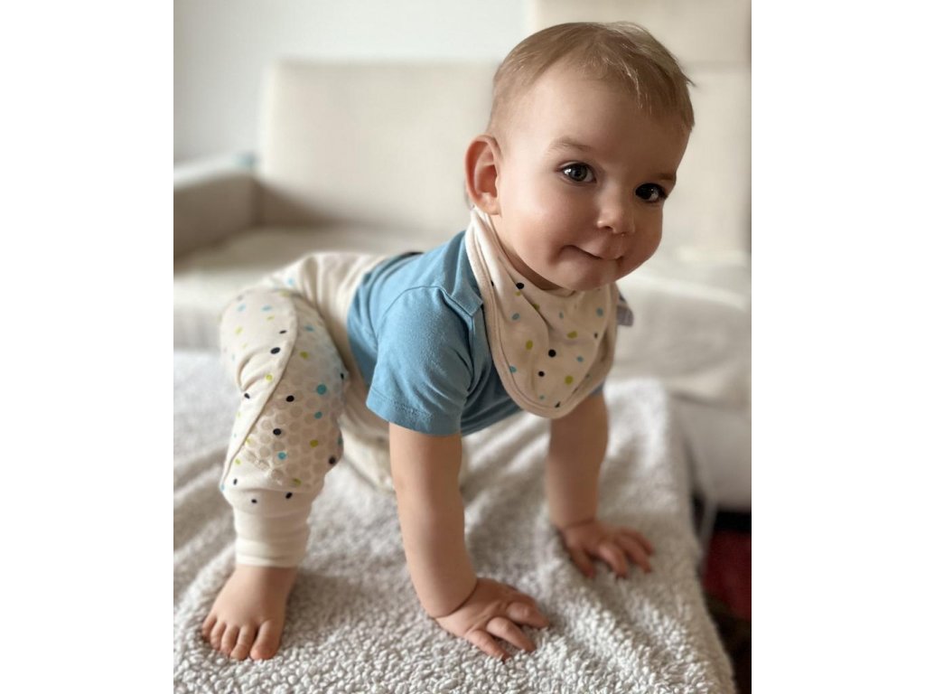 Detské nohavice vo veľkosti 86 s protišmykovou vrstvou na kolenách pre pohodlné lezenie v interiéri. Keď deti začínajú liezť, sú nestabilné a na plávajúcej podlahe, alebo na línu im to kĺže a môžu sa udrieť. Protišmyková vrstva na kolenách im pomôže zaistiť stabilitu. Nohavice majú lem v páse aj na nohaviciach a prehnutím, alebo natiahnutím je možné používať dlhšiu dobu ako nohavice klasické - vydržia aj cez dve veľkosti. Nohavice vyrábame v ČR z bio-bavlny. Možno ich prať otočené naruby v práčke pri 40 °C, protišmykové kolená sa nesmú žehliť.