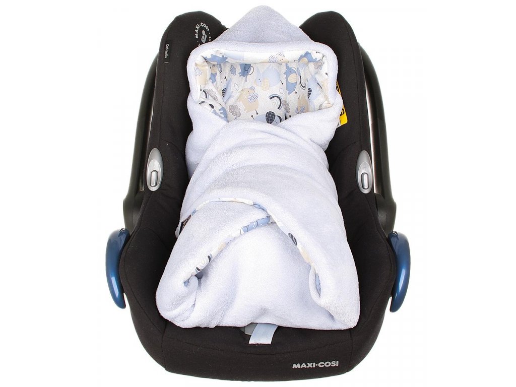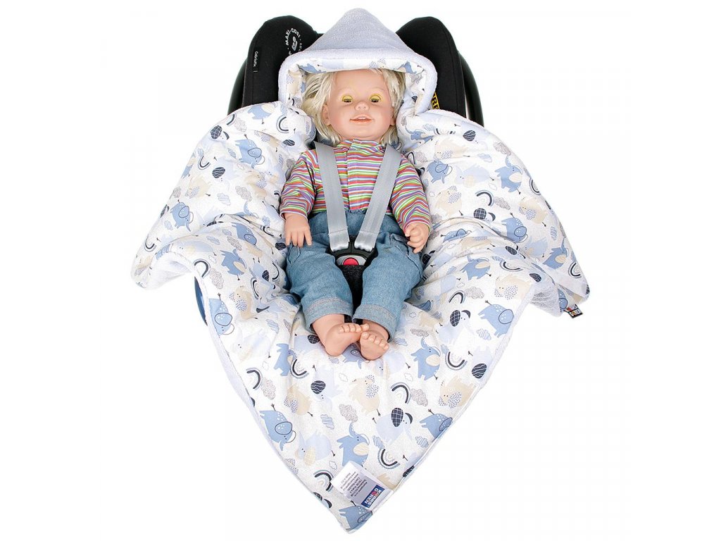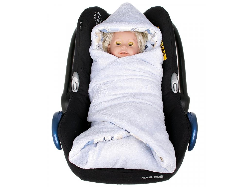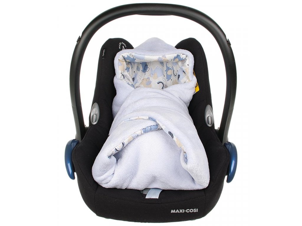 Modrá zateplená zavinka má vrchnú stranu z wellsoft, podšívku zo 100% bavlny a vo vnútri je vyplnená vatelínom. Zavinovačka má použitie od jesene do jari, je možné ju použiť do autosedačky s trojbodovým zapínaním. Rozmer zavinovačky je cca 75 x 75 cm, môže sa prať v práčke na 30 °C. Zavinovačka sa zapína na suchý zips a má aj praktickú kapucňu. Vyrábame v ČR.